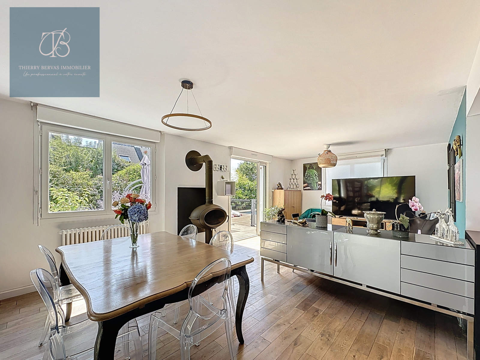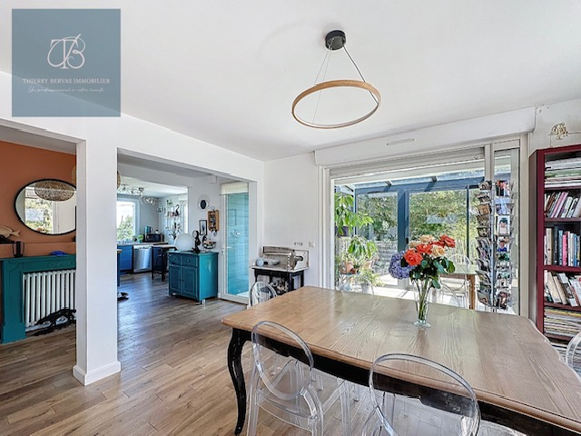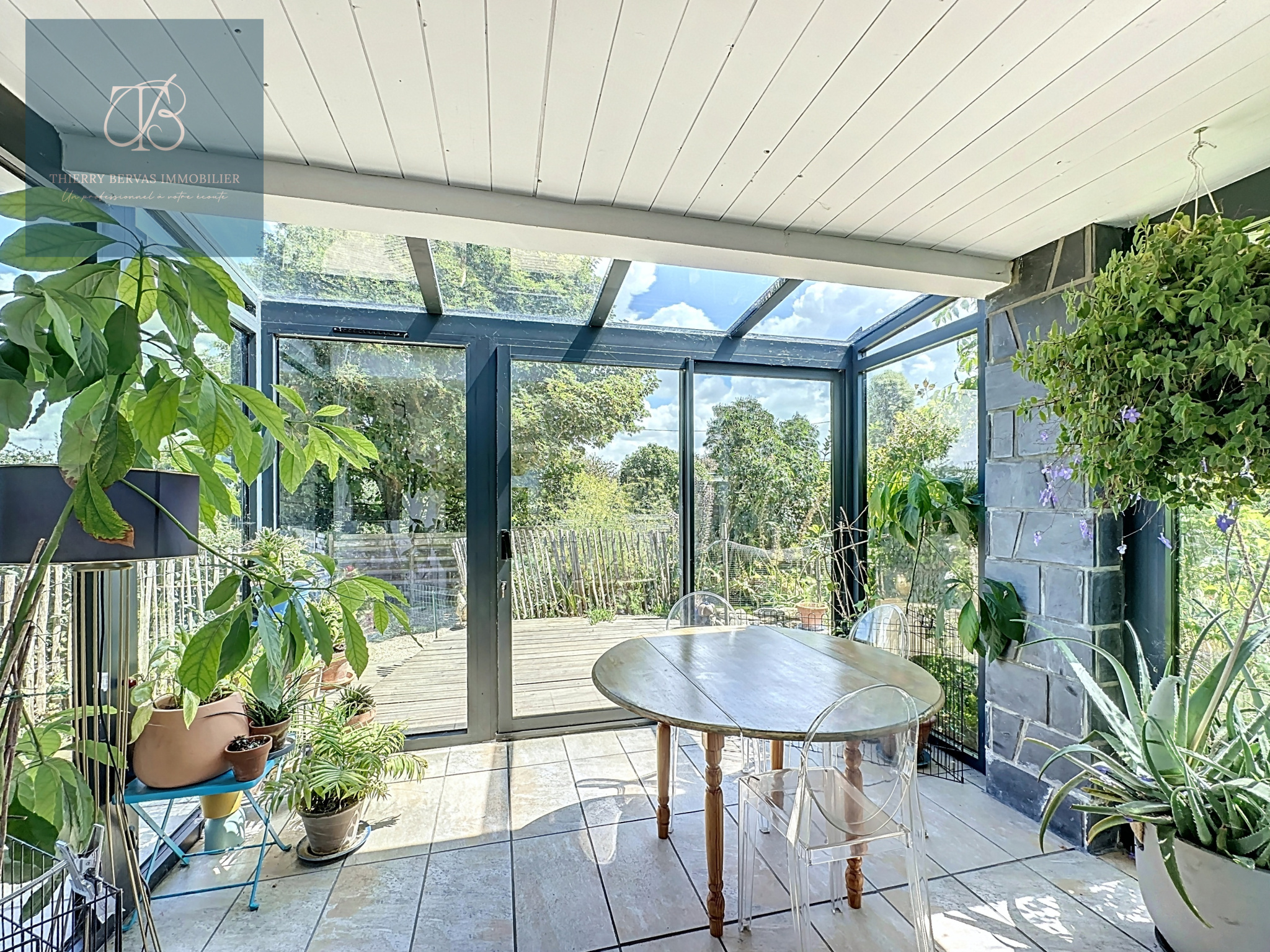 Dès l’entrée, vous serez séduit par la convivialité des lieux. Le rez-de-chaussée s’organise autour d’un salon-séjour lumineux, équipé d’un poêle, créant une atmosphère chaleureuse en toute saison. La cuisine aménagée et équipée est ouverte sur la salle à manger. En prolongement du séjour, une véranda spacieuse et baignée de lumière constitue un véritable lieu de vie supplémentaire, idéal pour profiter du jardin quelle que soit la météo. Une chambre, ainsi qu’une salle de bains avec WC, permettent une vie de plain-pied confortable.